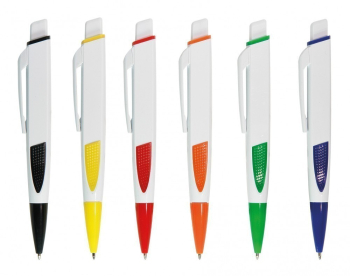 Πλαστικό στυλό \”SPACE\” πλακέ λευκό κορμό με χρωματιστές λεπτομέρειες σε διάφορα χρώματα ΔΑ 13,6 εκ Χ 1.4 εκ ,ΧΕ 5εκ Χ 0,8εκ
