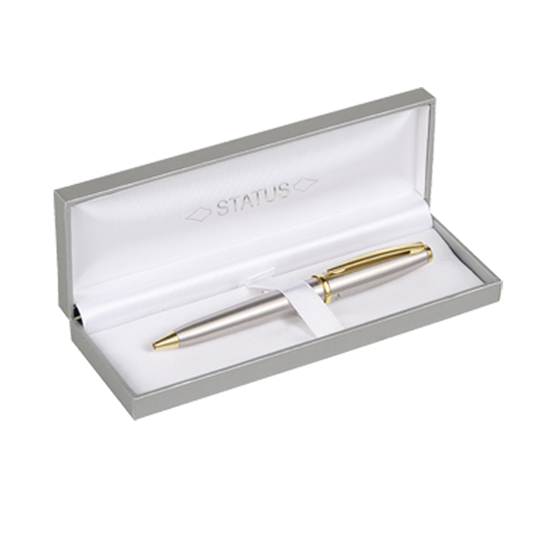 Στυλό zeus πολυτελείας μάρκας STATUS μαύρο με ασημί λεπτομέρειες σε γκρι κουτί με λευκό σατέν εσωτερικά